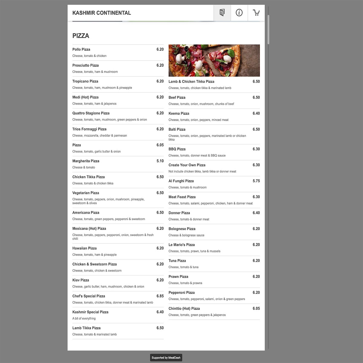 From a reviewer’s perspective, the menu at Kashmir Continental offers an impressively wide selection that caters to both traditional Indian cuisine lovers and those seeking familiar comfort foods. The starters, such as Onion Bhaji and Tandoori Chicken Starter, set a solid tone, while the Kashmiri specialties like Kashmir Special and Makkan Tikka showcase the restaurant’s signature flair. Classic favorites including Chicken Tikka Masala and Lamb Tikka Masala sit comfortably alongside spicier options like Chicken Jalfrezi and Chicken Vindaloo, giving diners flexibility in heat and flavor. The extensive curry range-featuring dishes like Chicken Korma, Meat Rogan Josh, and Chicken Bhuna-demonstrates a commitment to variety, though the absence of clearly listed prices makes it harder to gauge value at a glance. Beyond curries, the inclusion of items such as Margherita Pizza, Doner Kebab, and Beef Burger broadens the appeal, while sides like Pilau Rice and Bombay Aloo Bhaji complement the mains well. Overall, the menu feels abundant and inclusive, offering something for nearly every palate, even if more transparency on pricing would enhance the overall dining decision experience.